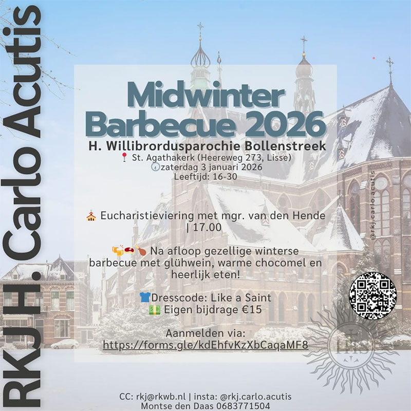 RKJ H. Carlo Acutis organiseert op zaterdag 3 januari 2026 een Midwinter BBQ in de H. Willibrordusparochie in de Bollenstreek. Om 17.00 uur begint de Eucharistieviering met hoofdcelebrant Mgr. Van den Hende. Daarna houden we een gezellige, winterse barbecue met glüwein, warme chocomel en heerlijk eten! Doelgroep: 16-30 jaar Aanmeldformulier: