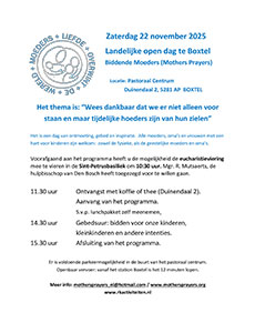 Op zaterdag 22 november 2025 wordt in Boxtel de Landelijke Open Dag gehouden van Biddende Moeders / Mothers Prayers. Thema is “Wees dankbaar dat we er niet alleen voor staan en maar tijdelijke hoeders zijn van hun zielen”. Het is een dag van ontmoeting, gebed en inspiratie. Alle moeders, oma’s en vrouwen met een hart voor kinderen zijn welkom: zowel de fysieke, als de geestelijke moeders en oma’s. Voorafgaand aan het programma heeft u de mogelijkheid de eucharistieviering mee te vieren in de Sint-Petrusbasiliek om 10:30 uur. Mgr. R. Mutsaerts, de hulpbisschop van Den Bosch heeft toegezegd voor te willen gaan. Programma Praktisch