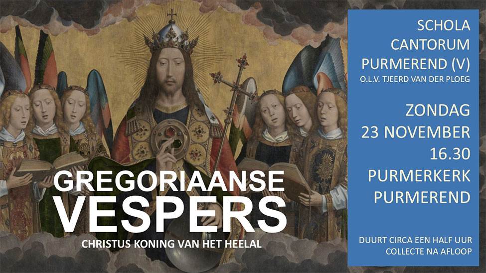 Op zondag 23 november verzorgen de vrouwen van de Schola Cantorum Purmerend de gregoriaanse vespers van ’Christus Koning van het Heelal’ in de Purmerkerk aan de Westerweg 50 te Purmerend.
