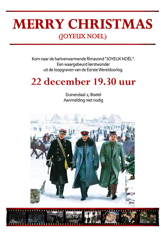 Op maandagavond 22 december wordt in Boxtel een filmavond georganiseerd met de film ‘Merry Christmas’ (Joyeux Noel).