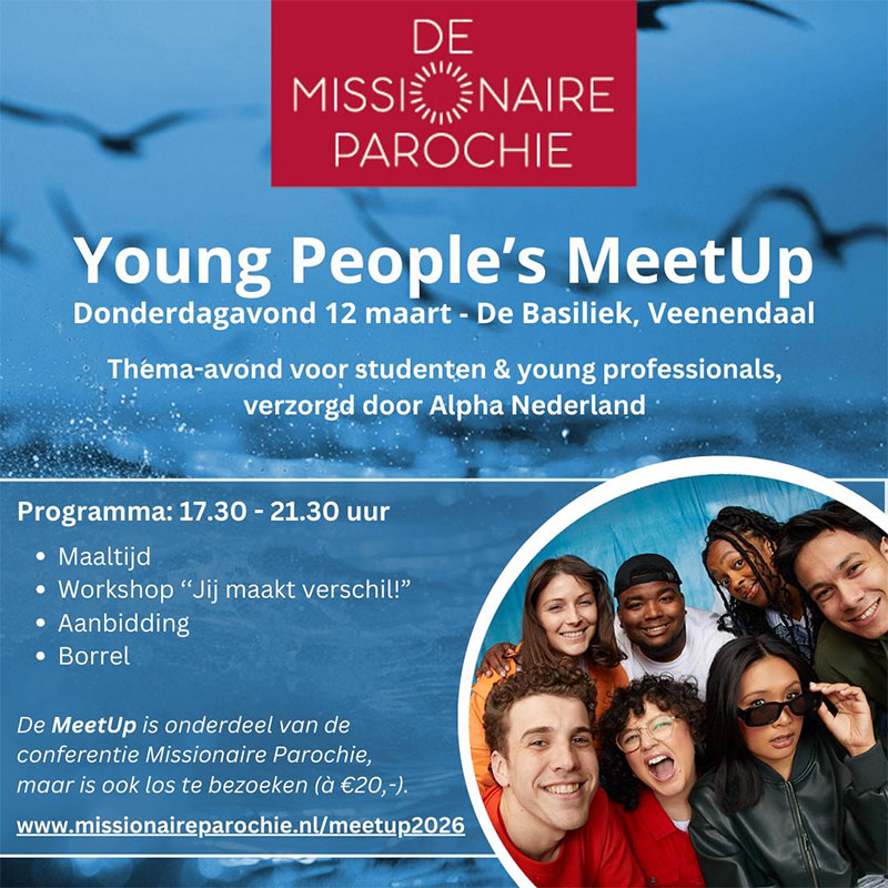 Wat kun jij als jongere betekenen in de beweging naar missionaire parochies? De jaarlijkse Young People’s MeetUp voor studenten en young professionals vindt dit jaar plaats als programma-onderdeel van de conferentie Missionaire Parochie, op donderdagavond 12 maart 2026. Thema In een missionaire parochie zijn alle generaties vertegenwoordigd. Als jongvolwassene heb je daarin een unieke rol. Je zit zelf in de overgang van tiener of twintiger naar volwassene. Je kunt connecten met de jongere generatie en tegelijkertijd je weg vinden tussen de volwassenen. Daarmee ben je een unieke verbinder van generaties. De jonge generatie is enorm geïnteresseerd in het christelijke geloof. Er zijn veel parochies die niet weten wat ze moeten met al die jongeren die komen aanwaaien. De generatie boven je is misschien wel de generatie die ontbreekt in veel parochies... Wat kun jij doen? Dit jaar wordt de Young People’s MeetUp verzorgd door Alpha Nederland. Bij Alpha Nederland zien ze hoe steeds meer parochies met Alpha Youth aan de slag gaan om Generatie Z en Generatie Alpha te laten kennismaken met het christelijk geloof. Deze jonge generatie is enorm vrijmoedig. Vrienden en vriendinnen nodigen ze gemakkelijk uit, maar ze zetten ook de generatie van hun ouders weer aan het nadenken. Wil jij ontdekken wat jij binnen jouw invloedssfeer kunt doen? Praktische informatie Inhoud