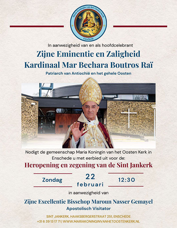 De gemeenschap Maria Koningin van het Oosten in Enschede nodigt iedereen uit op zondag 22 februari 2026 voor de heropening en zegening van de Sint Jankerk. Hoofdcelebrant is kardinaal Mar Bechara Boutros Raï en ook apostolisch visitator Mgr. Maroun Nasser Gemayel zal aanwezig zijn.