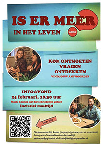 Op dinsdagavond 24 februari 2026 start in Boxtel weer een Alphacursus. Is er meer in het leven? Kom ontmoeten , vragen en ontdekken. Vind jouw antwoorden. De infoavond begint om 18.30 uur en is inclusief maaltijd. Wel graag aanmelden ivm de maaltijd.