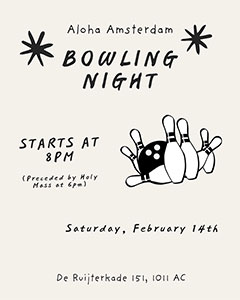 The evening will be preceded by Holy Mass in the Onze Lieve Vrouwekerk at the Keizersgracht at 18:00. Bowling will start at 20:00 at Aloha Amsterdam.