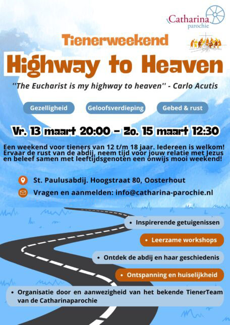 Van vrijdag 13 maart 20.00 uur tot zondag 15 maart 12.30 uur organiseert de Catharinaparochie in samenwerking met het bisdom Breda een inspirerend en gezellig tienerweekend in de prachtige St. Paulusabdij in Oosterhout. Het thema van dit weekend is “Highway to Heaven”, geïnspireerd door de woorden van Carlo Acutis: “The Eucharist is my highway to heaven.”