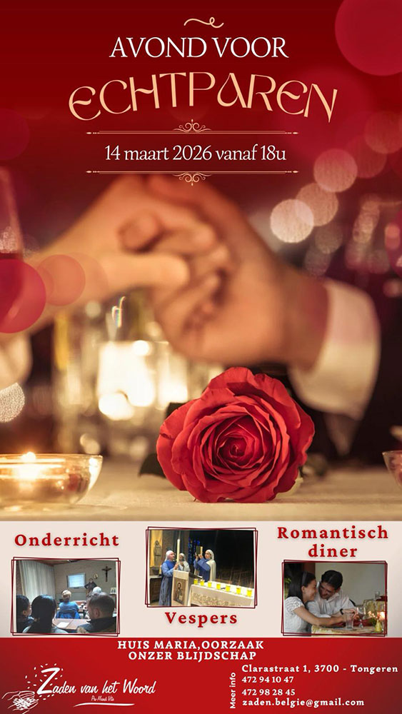 Op zaterdag 14 maart 2026 houdt de Gemeenschap Zaden van het Woord een avond voor echtparen in Tongeren.