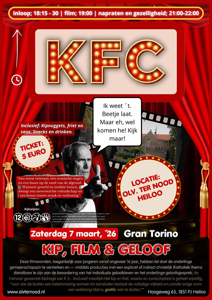 Op zaterdag 7 maart organiseren we een nieuwe avond van KFC (Kip, Film & Geloof) in Heiloo! Een avond vol diepgang, gezelligheid en natuurlijk een goede maaltijd.