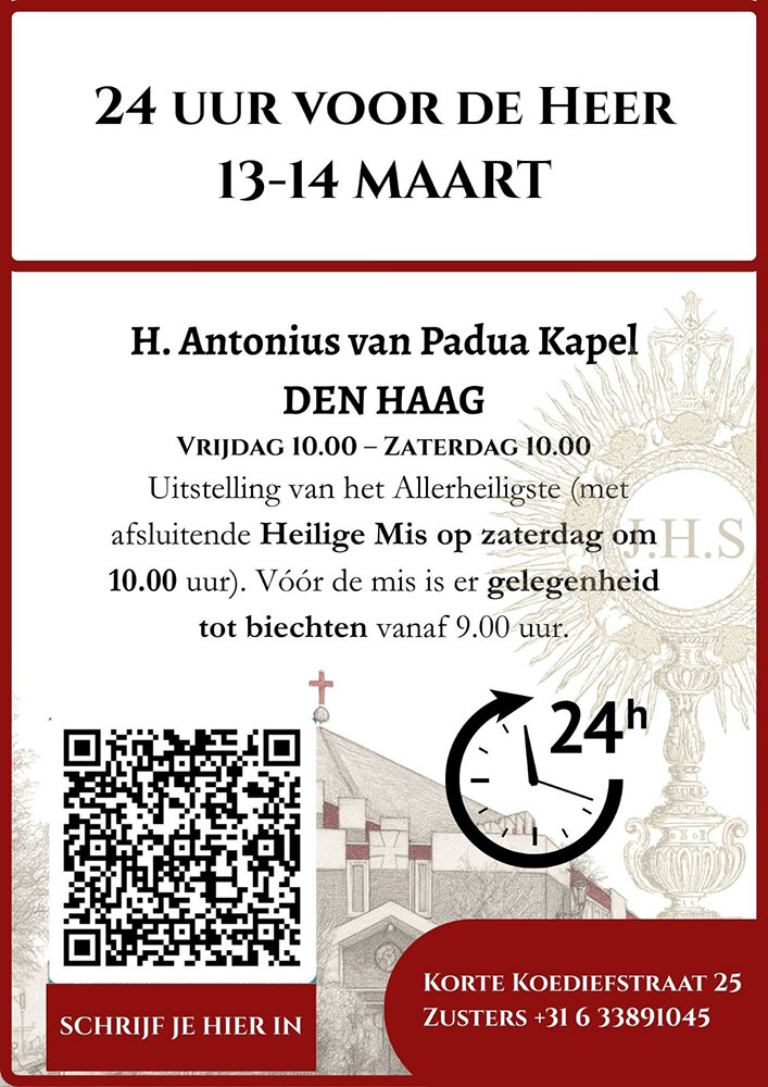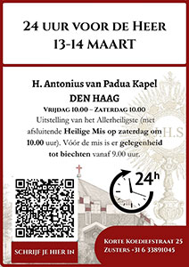 Vanaf vrijdag 10.00 uur tot zaterdag 10.00 uur 24 uur Eucharistische Aanbidding in de Antonius van Paduakapel in den Haag. Afsluitend H. Mis op zaterdag om 10.00 uur. Vóór de mis is er vanaf 9.00 uur gelegenheid tot biechten.