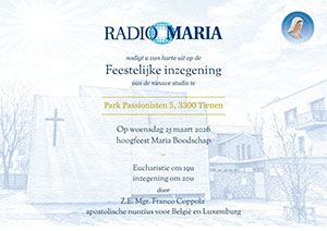 Op woensdag 25 maart 2026, op het Hoogfeest van Maria Boodschap, zal de inzegening plaatsvinden van de nieuwe studio van Radio Maria België in Tienen! De inzegening zal worden gedaan door Z.E. Mgr. Franco Coppola, apostolisch nuntius voor België en Luxemburg. Iedereen is van harte welkom vanaf 19.00 uur! Programma