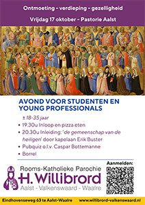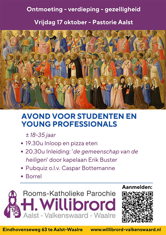 beschrijving | ![]() De H. Willibrordparochie van Aalst - Valkenswaard - Waalre houdt op vrijdagavond 17 oktober 2025 een avond voor studenten en young professionals van 18~35 jaar. 19.30 uur - Inloop en pizza Aanmelden mbv dit Google formulier:
