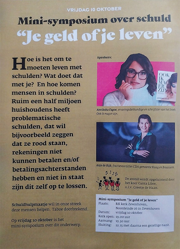 Thema dit jaar: Je geld of je leven. Over schulden en het werk van Schuldhulpmaatje. Als kerk ondersteunen wij Schuldhulpmaatje Nieuwkoop en Kaag en Braassem i.o.