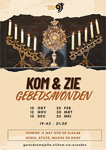 A Come & See evening starts at 19:45 in the friars’ priory with coffee and tea. Then a programme of praise, an introduction and testimony, and Eucharistic adoration with music, silence and free prayer follows in the church from 20:15. From 21:30 - 22:00 there will be closing drinks in the basement of the church, where there will be room for meeting and sharing. Parishioner or not, old or young, everyone is welcome (even if you can only join for part of it). Come and see!