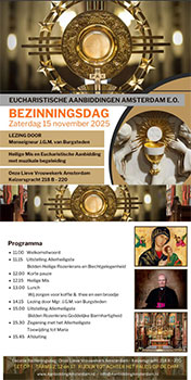 Zaterdag 15 november is van 11.00-16.00 uur in de O.L.V.-kerk (Keizersgracht 218B, Amsterdam) een bezinningsdag over eucharistische aanbidding door mgr. Jan van Burgsteden sss. Sinds 2010 is er in de ‘heilige stede van het Mirakel’ op alle dagen (en in sommige nachten) in diverse kerken en kapellen verspreid over Amsterdam gelegenheid tot (stille) aanbidding van het Allerheiligst Sacrament.