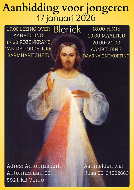 De volgende aanbidding voor jongeren wordt gehouden op zaterdag 17 januari 2026 in de Antoniuskerk te Blerick. Programma