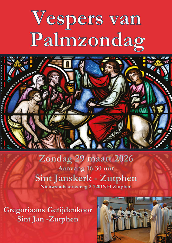 Het eerste Vespers dat zal worden gezongen door het Gregoriaans Getijdenkoor Sint Jan Zutphen is op zondag 29 maart 2026 vanaf 16.30 uur in de Sint Janskerk te Zutphen.
