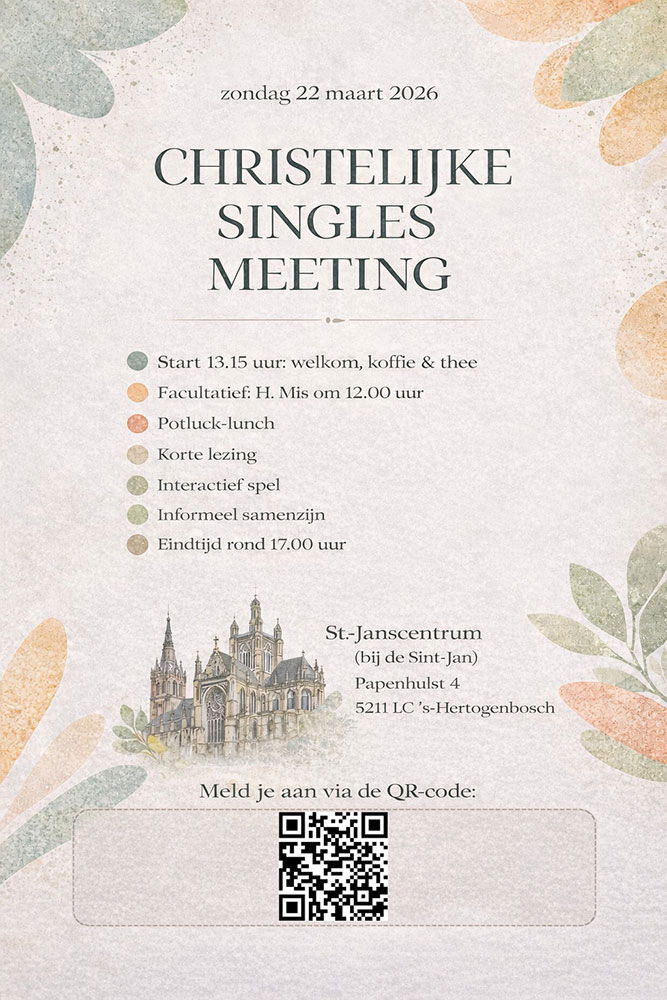 Op zondag 22 maart wordt een bijeenkomst van christelijke singles georganiseerd in Den Bosch voor jongeren van 18 tot 45 jaar.