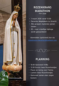 Op zondag 1 maart 2026 vanaf 12.00 uur wordt in de Gerardus Majellakerk te Utrecht de Rozenkrans gezamenlijk gebeden - dus alle vier mysteries, vier Rozenhoedjes. Vrije bijdrage Aanmelden via rozenkrans-marathon@outlook.com Planning