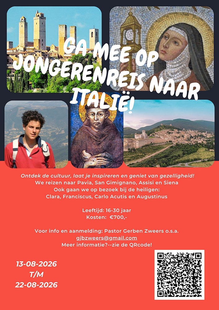 Pastor Gerben Zweers en pastoraal werkster Hedwig Mensink organiseren samen met een aantal andere jongeren een reis naar Italië. Dit wordt een hele mooie reis want die gaat naar een aantal bijzondere plaatsen. We zullen overnachten in Assisi. Dit prachtige middeleeuwse stadje is de plaats waar Franciscus leefde en werkte. Deze heilige is bekend om zijn eenvoud en hoe hij leefde met de natuur. Hij ligt hier begraven. Maar hij is niet de enige: ook de heilige Clara ligt hier begraven en ook de heilige Carlo Acutis. Carlo Acutis is een hele jonge heilige uit onze eeuw. We gaan ook naar San Gimignano. Ook dit is een prachtig middeleeuws stadje dat bekend is om zijn hoge torens. We overnachten in het 14de eeuwse augustijnenklooster. Van daaruit bezoeken we de mooie stad Siena en het verborgen kloostertje van Lecceto. Op de terugreis overnachten we in Pavia. Hier ligt de heilige Augustinus begraven. Dit was een heel geleerde bisschop die veel geschreven en gepreekt heeft. Zijn werk is nog steeds van belang voor vandaag. Deze reis is voor jongeren van 16 tot en met 30 jaar. We rijden er met 9 persoonsbusjes naar toe. Onderweg zullen we overnachten in München en Freiburg. De reis is van 13-22 augustus en kost ongeveer €700,00. De reis is een mengeling van cultuur, gezelligheid en inspiratie. We bezoeken mooie stadjes en plaatsen, we hebben veel tijd met elkaar (af en toe koken we zelf!) en we hebben vieringen in mooie kerken. Dit is natuurlijk een reis die je niet kunt missen! Je kunt je opgeven tot 1 juli bij: