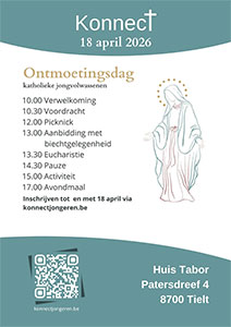 Een dag vol geloof, verbinding en verdieping: een voordracht over de Verrijzenis, aanbidding, een Mariamis en een creatieve buitenactiviteit in Tielt. Programma We voorzien soep bij het middag- en avondeten - breng wel je eigen picknick mee! Of je nu gelooft, twijfelt of gewoon nieuwsgierig bent: je bent van harte welkom. Inschrijven t/m 18 april via www.konnectjongeren.be