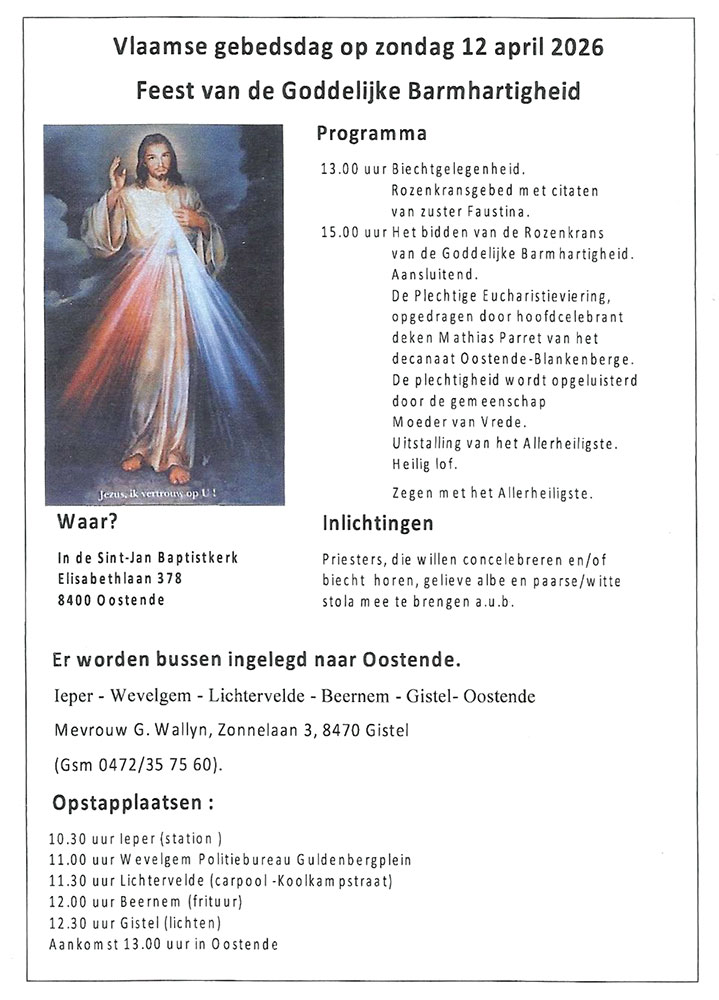 Op zondag 12 april, Zondag van de Goddelijke Barmhartigheid, is iedereen welkom in Gistel.