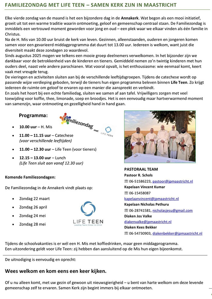 Tijdens de familiezondag van Lifeteen op 26 april 2026 komt Mgr. Ron van den Hout meevieren. Heel fijn als veel opa’s, oma’s, papa’s, mama’s hun kinderen en kleinkinderen meenemen. Dit is een bijzondere gelegenheid om de bisschop te leren kennen. Programma