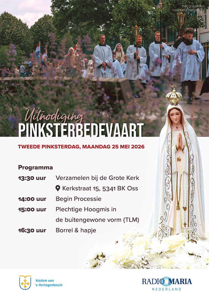 Op Tweede Pinksterdag wordt weer een Pinksterbedevaart gehouden in Bisdom ’s-Hertogenbosch. U bent van harte welkom voor een plechtige Hoogmis in de Oude Vorm, voor onverkapte Mariaverering in de vorm van een prachtige Processie door de straten van Oss en voor ontmoeting, gezelligheid en iets lekkers. Programma